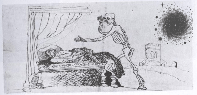 Elizabeth Gaskell’s biography of Charlotte Brontë reports an eye-witness account that Branwell, wanting to show the power of the human will, decided to die standing up, “and when the last agony began, he insisted on assuming the position just mentioned.”[5] That another eye-witness account reveals he then proceeded to point upward to the sky with a look of abject fear before collapsing dead has since been stricken from the account.