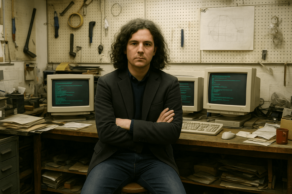 Born in Ulverston in 1968, Ellison’s biography has by now assumed the status of anecdotal folklore in the London art scene. His disavowal of early art instruction — he reportedly endured a disenchanting teacher named Mr. Newnham at junior school, a figure he once described as “an evangelist for beige and boring pottery.”1 — has been endlessly recycled by critics seeking to frame his later embrace of computational determinism as a kind of revenge upon pedagogy. This early disenchantment with institutional art training perhaps explains his later recourse to systems thinking, and it was while working at the neighbouring town’s shipyard as a draftsman that Ellison created the first iteration of his Automathicon: a hybrid apparatus comprising early home-computing programming, algorithmic flowcharts, and an extensive “library of contradictions” drawn from physics, theology, and speculative fiction.2
